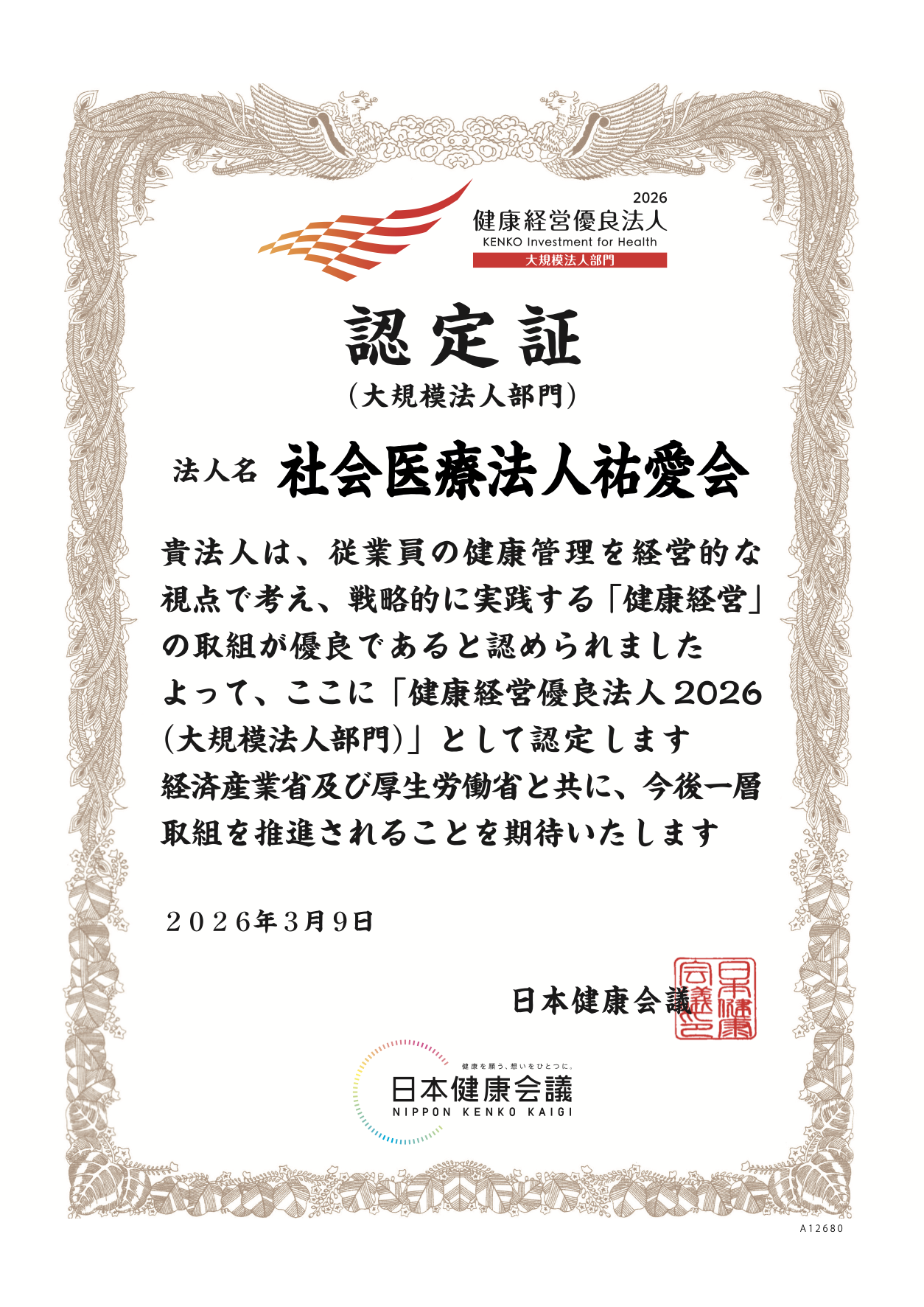 社会医療法人 祐愛会は2026年3月11日付けで「健康経営優良法人2026」(大規模法人部門)の認定を受けました。